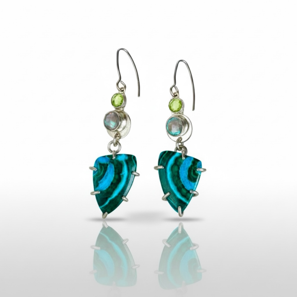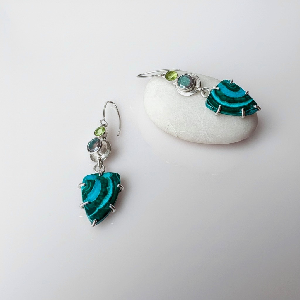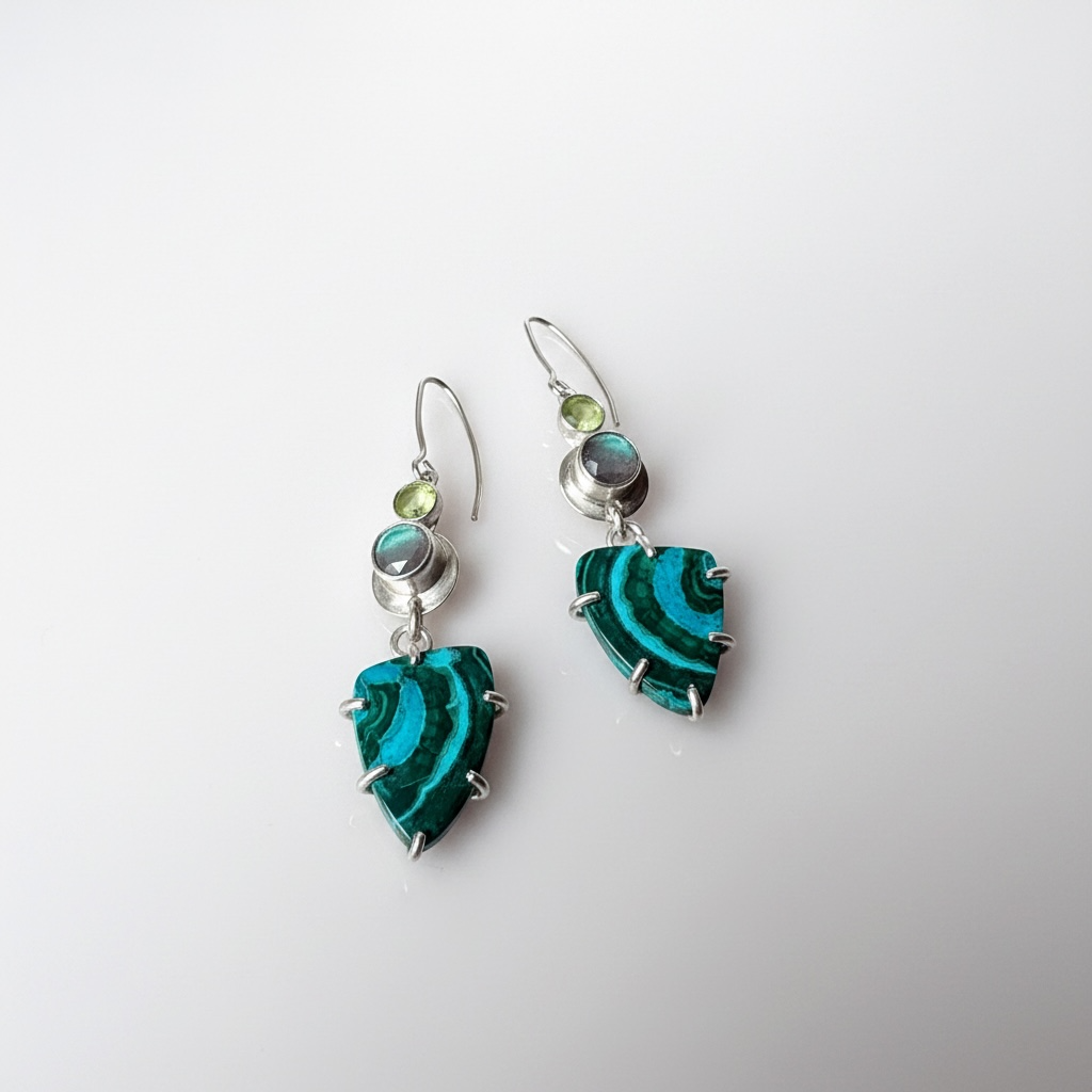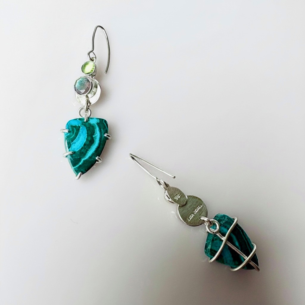 This piece features a stunning azurite malachite stone, beautifully complemented by faceted labradorite and vibrant lime-green peridot, all set in sterling silver. Inspired by nature and her surroundings, this design reflects Lisa’s signature style. Signed by Lisa Scala and marked .925 sterling.