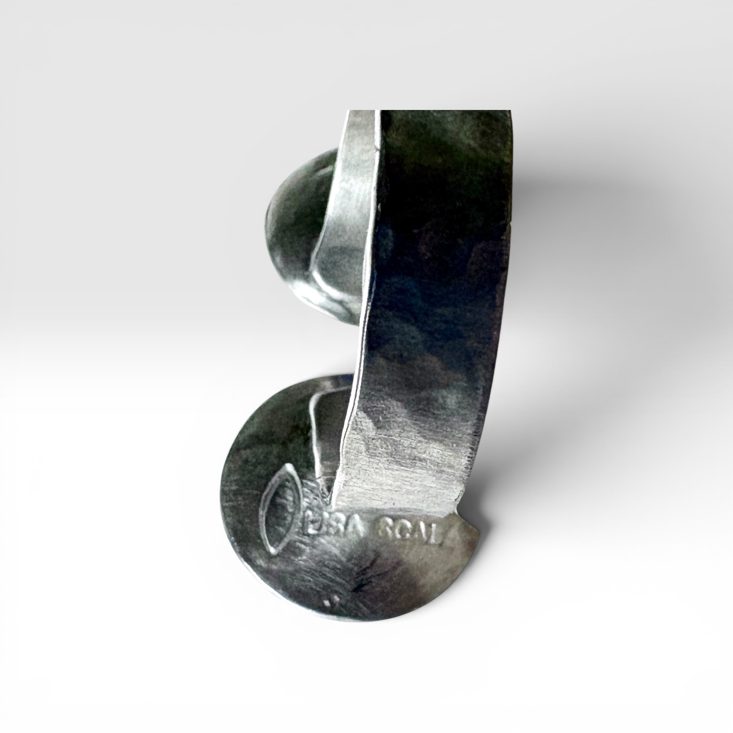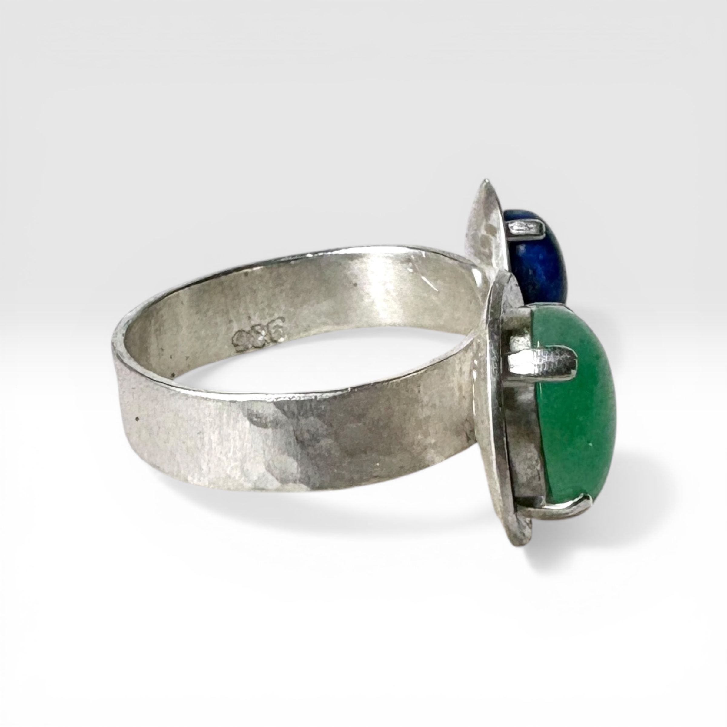 One-of-a-kind style! This handcrafted statement ring features a stunning cabochon Lapis Lazuli and a Chrysoprase gemstone prong set against a sterling silver frame. In addition, it sits on a hand-textured sterling silver band that enhances the design. Furthermore, it showcases beautifully textured surfaces with an asymmetrical yet balanced design, creating a refined contrast that feels both organic and intentional. Finally, it is signed by Lisa Scala and marked .925 sterling.
