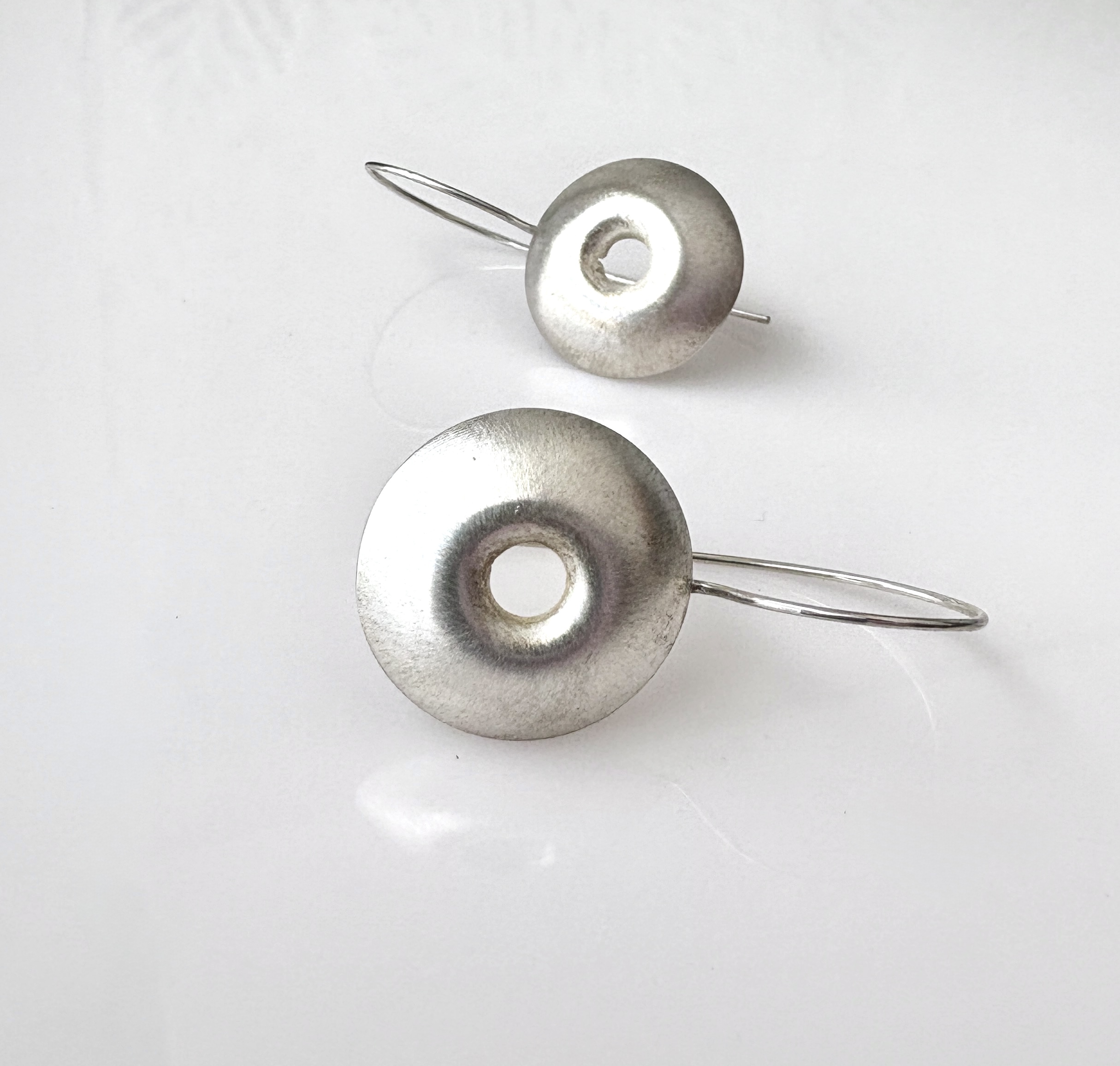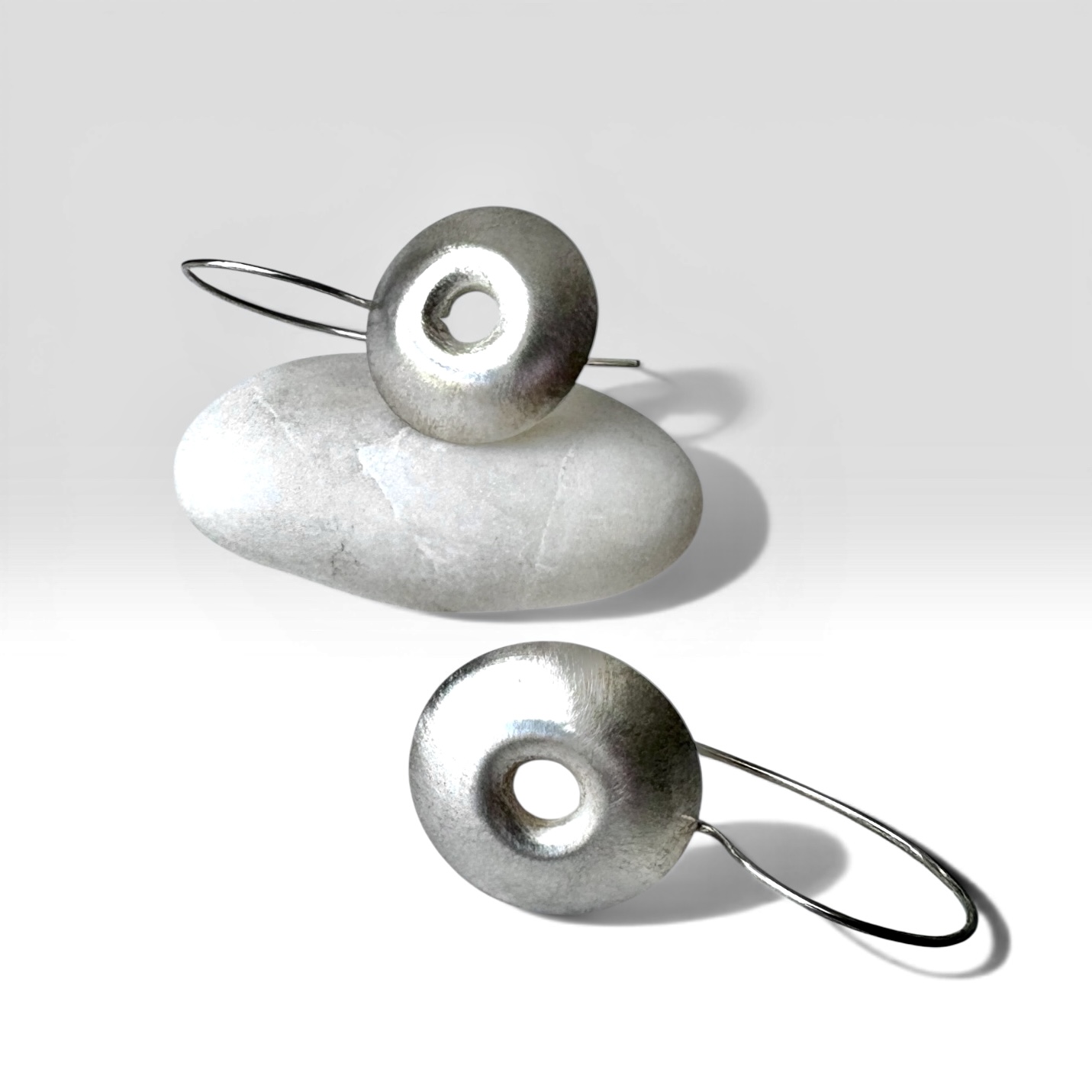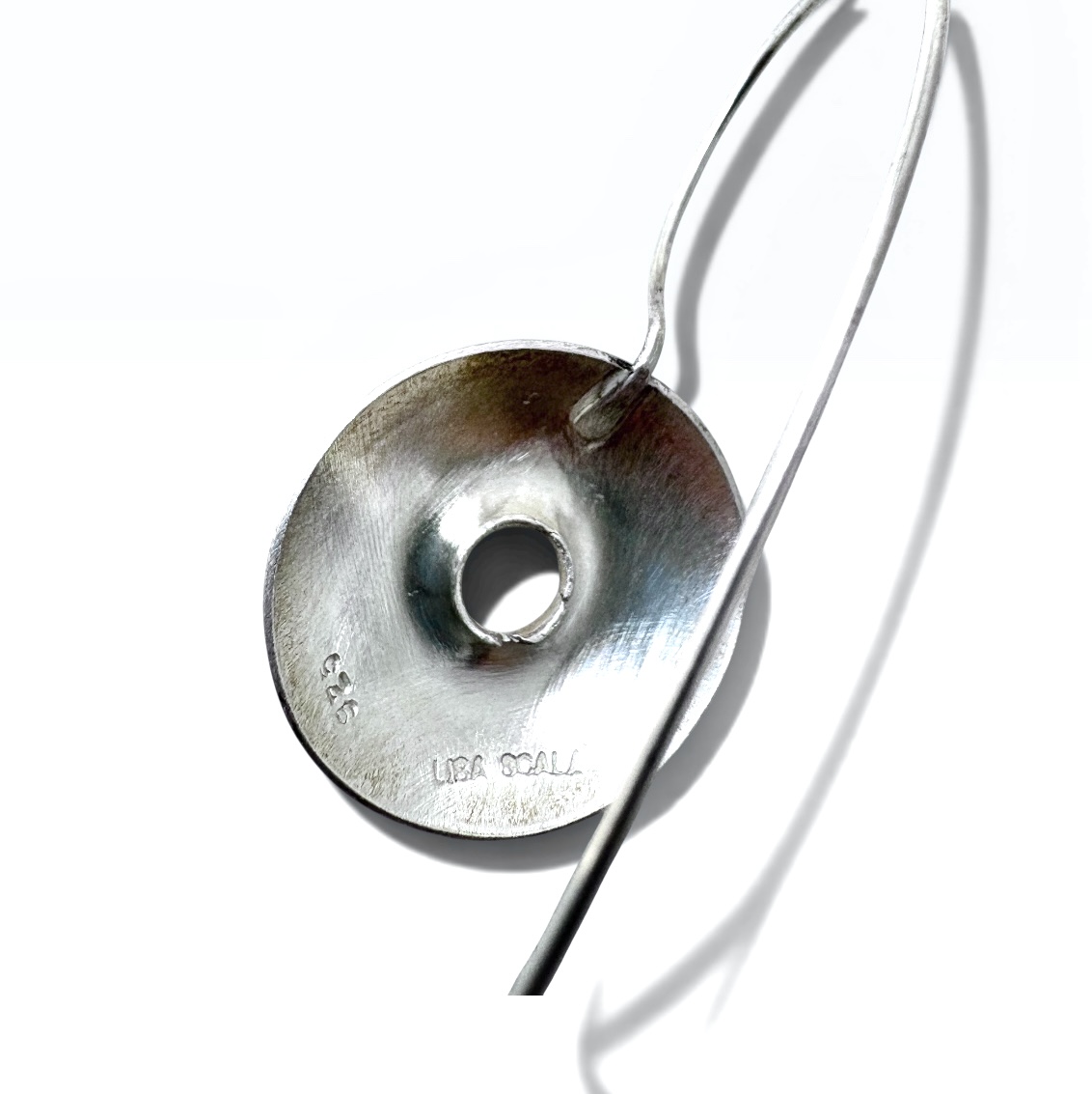 Sophisticated simplicity with an edgy appeal! These handcrafted, sterling silver minimalist earrings feature subtly textured, concave disks connected to aesthetically designed ear wires. Signed by Lisa Scala and marked .925 sterling.