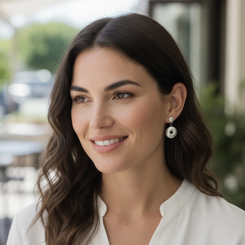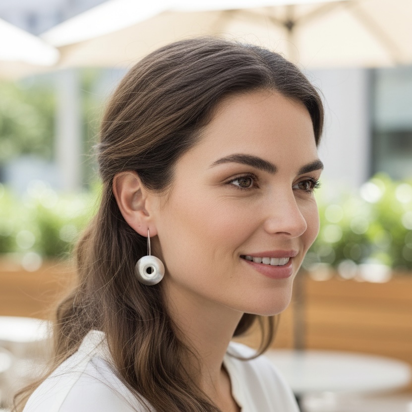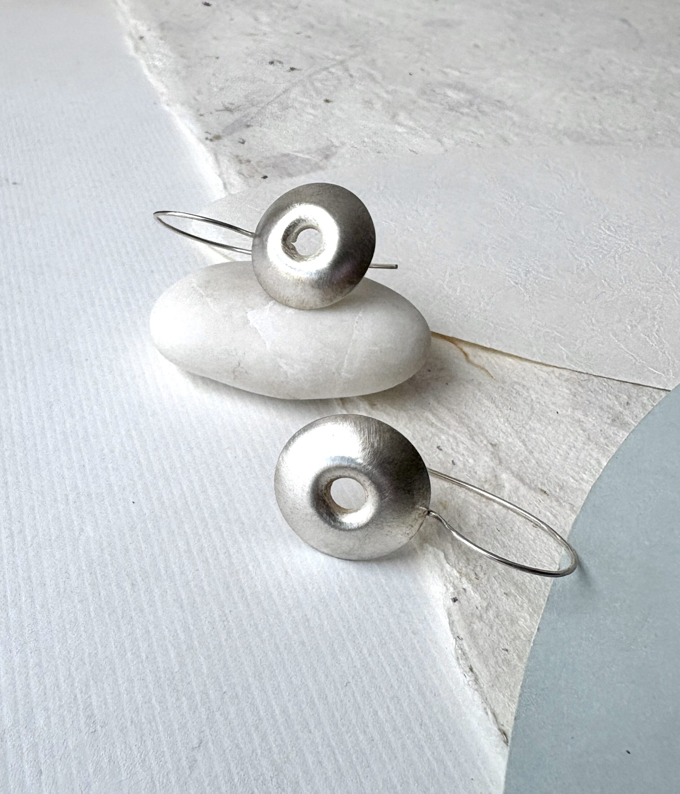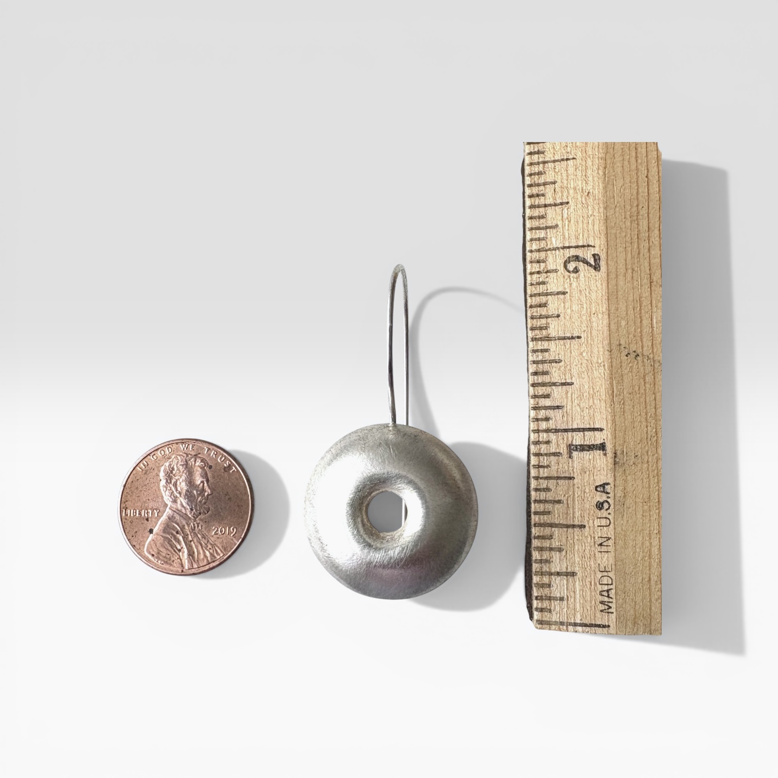 Sophisticated simplicity with an edgy appeal! These handcrafted, sterling silver minimalist earrings feature subtly textured, concave disks connected to aesthetically designed ear wires. Signed by Lisa Scala and marked .925 sterling.