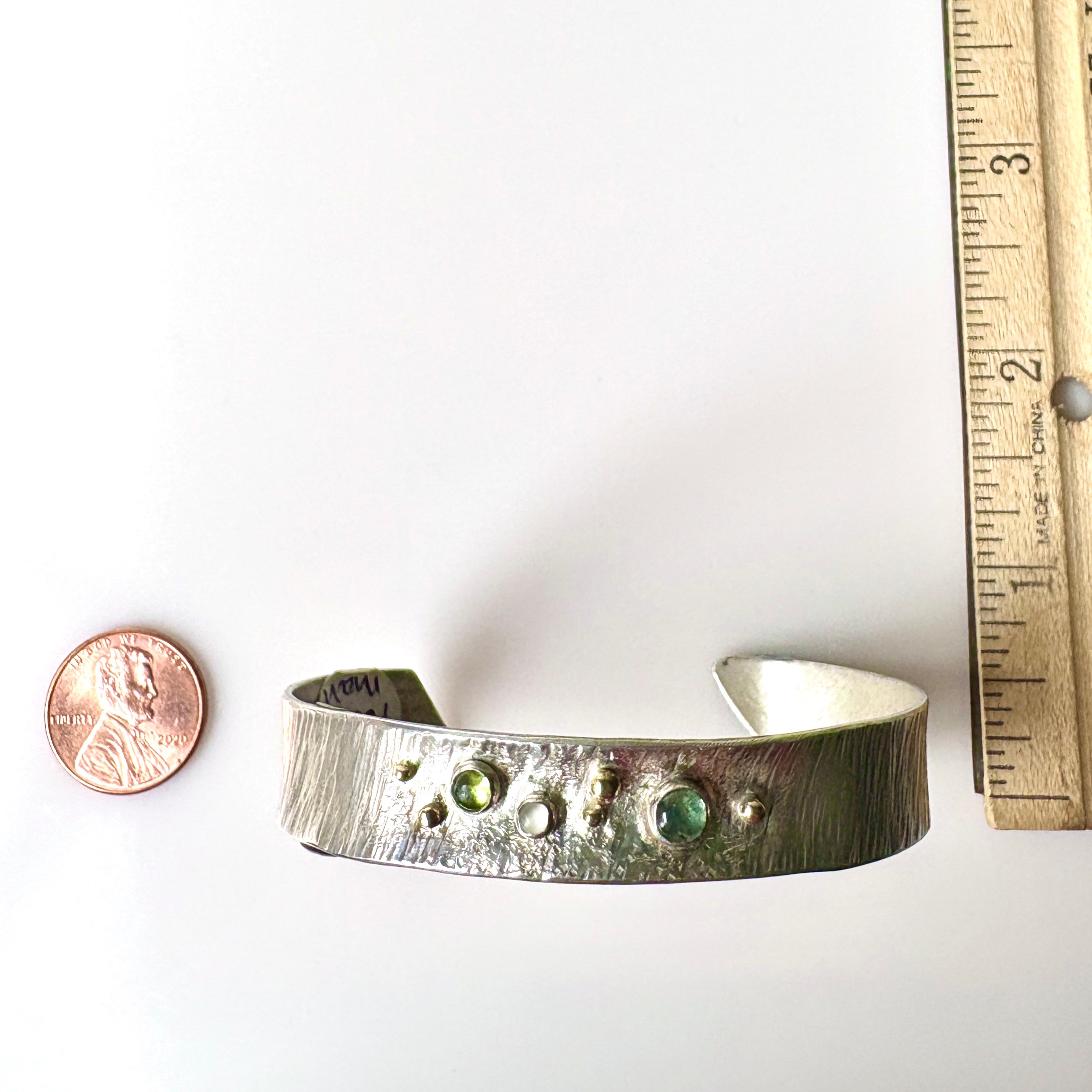 A great textured statement piece! This handcrafted, sterling silver cuff features an eye-catching hammered finish highlighting the cabochon tourmaline, peridot and moonstones as well as 14k gold granules (balls).