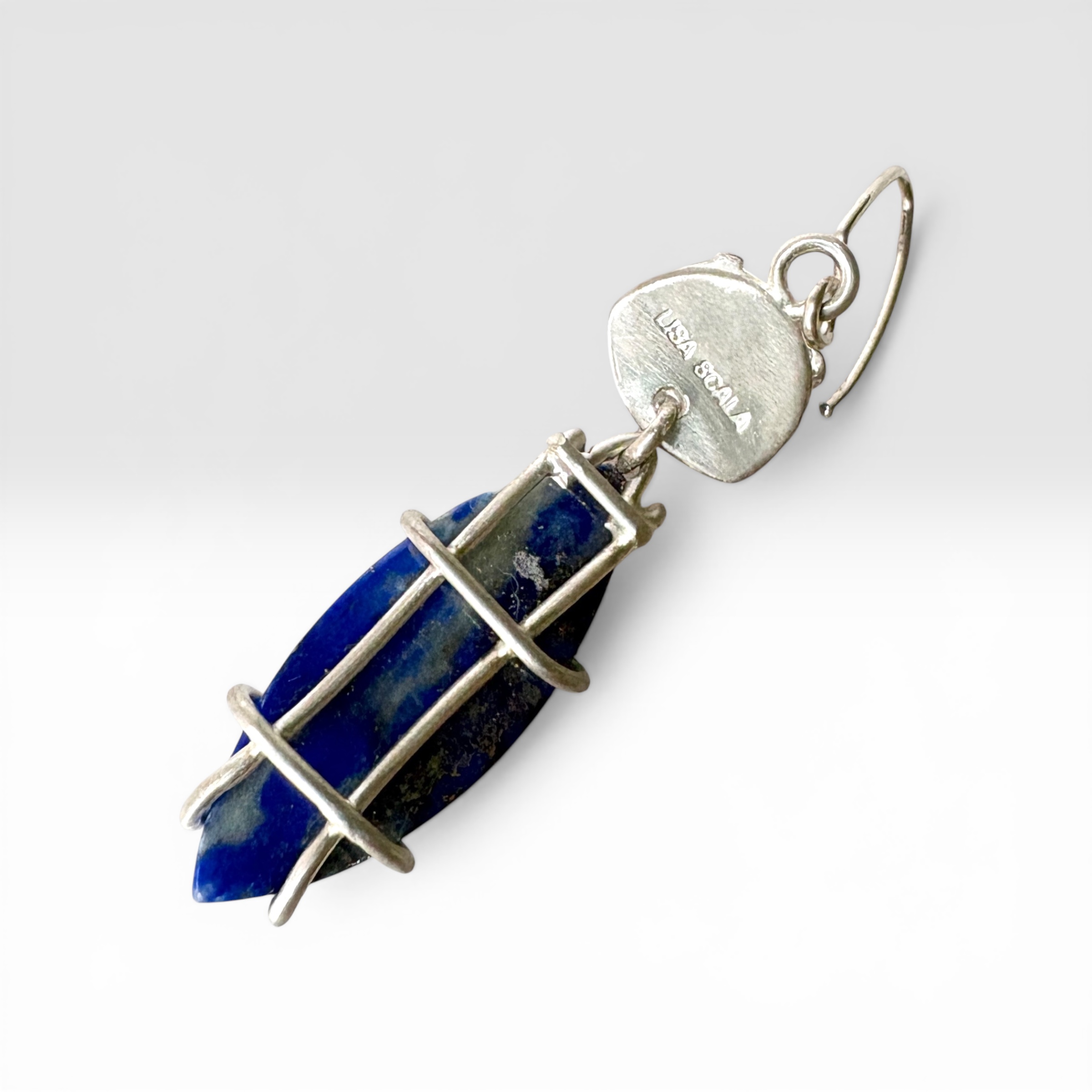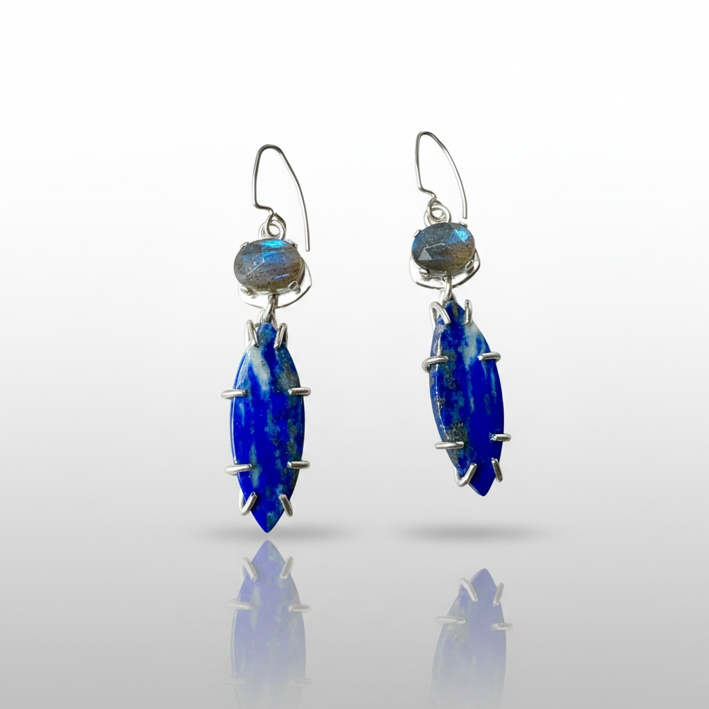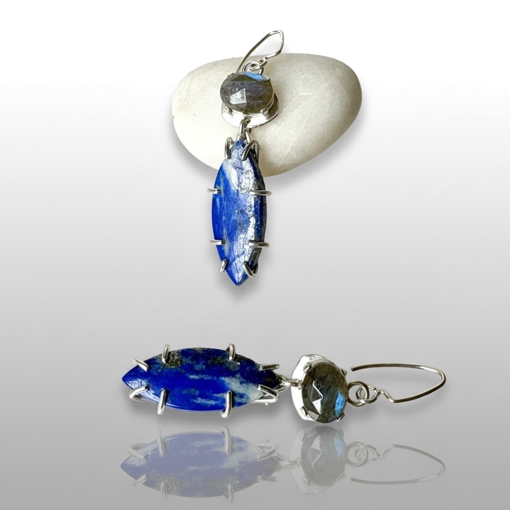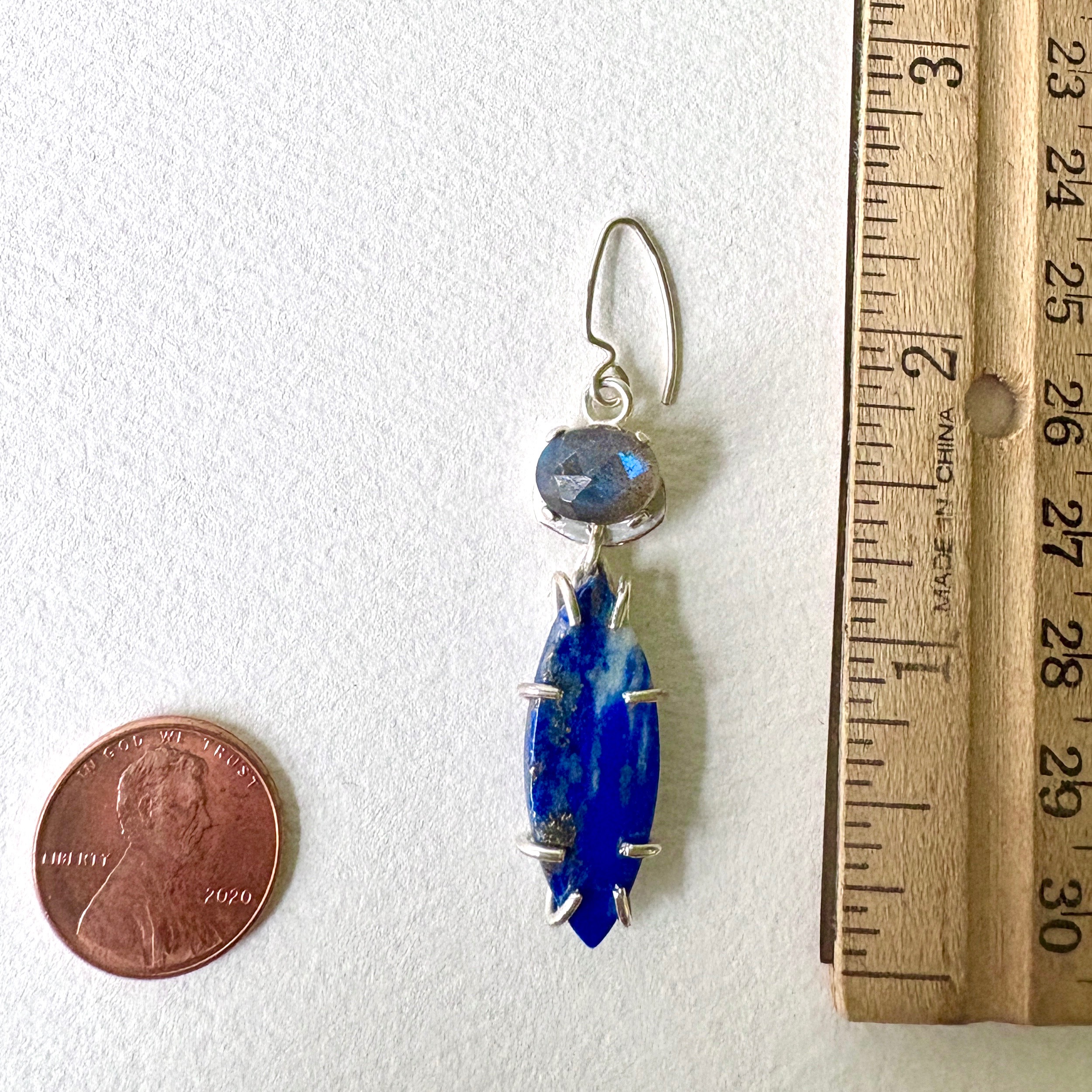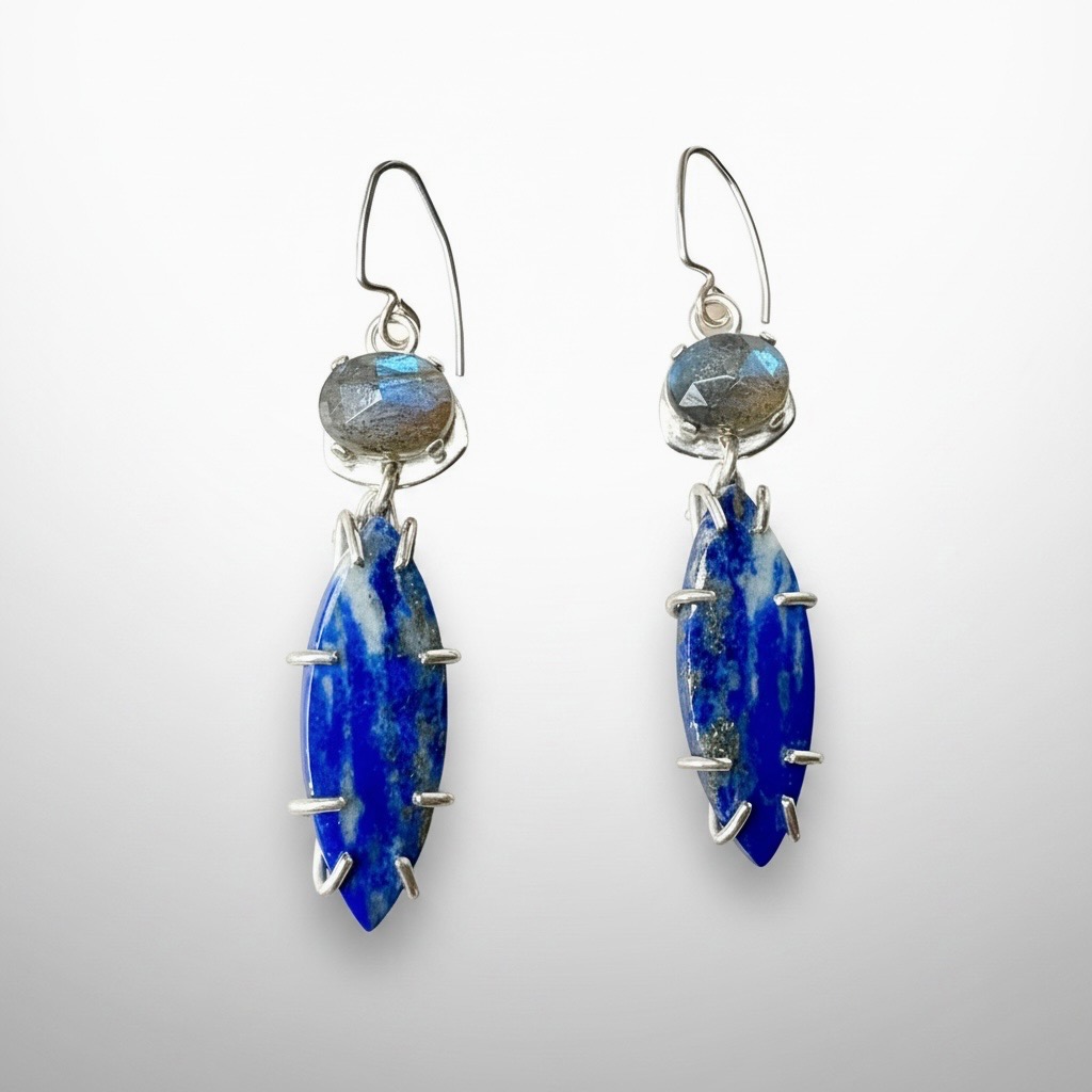 Handmade in sterling silver, these unique earrings combine variegated lapis lazuli marquise gemstones with faceted labradorite cabochons. In addition, the prong-set gemstones feature prominent silver work to set off the rich blue color. Signed Lisa Scala and marked .925 sterling.