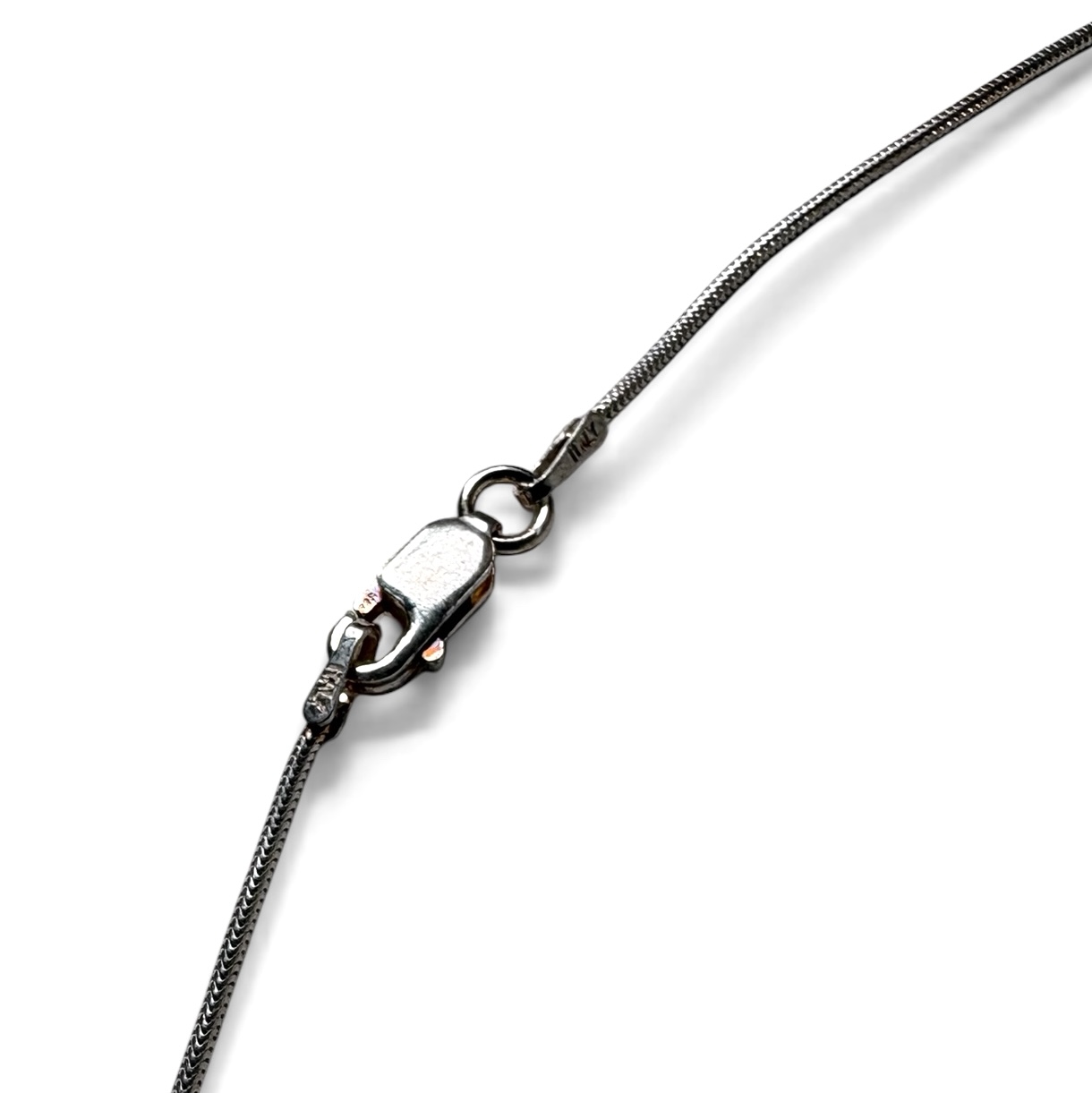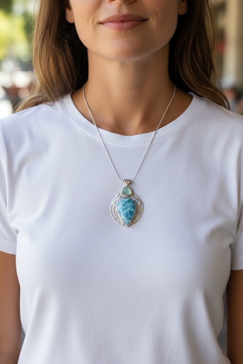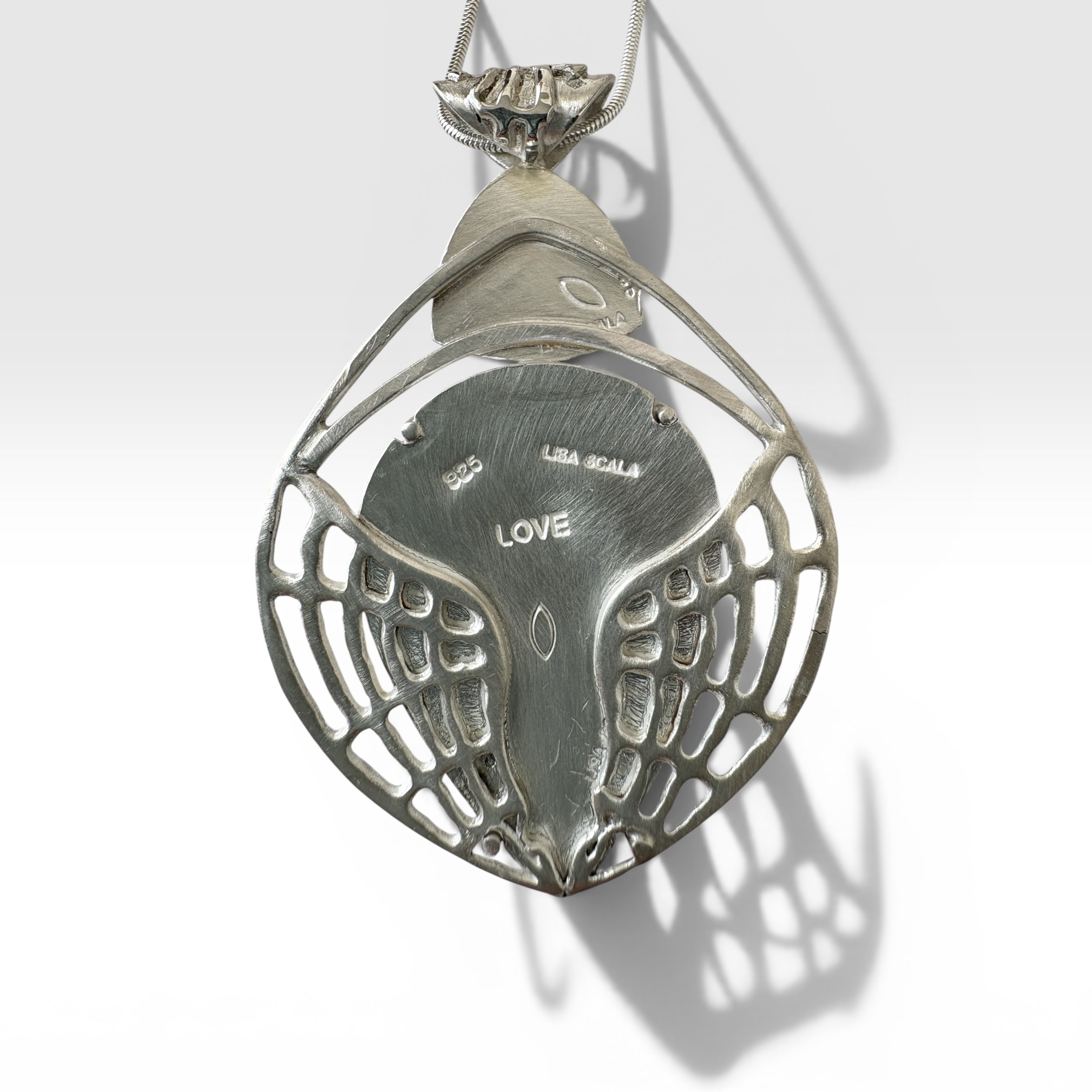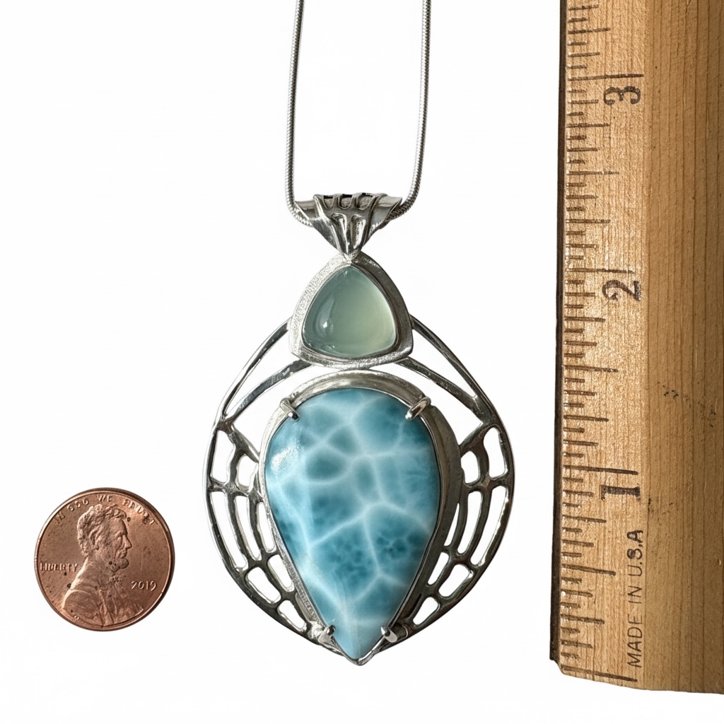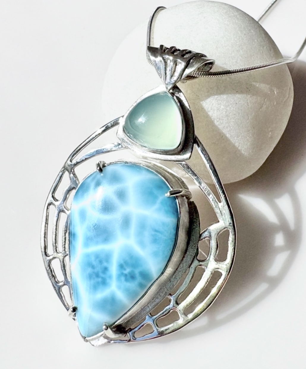 Sea Spirit Necklace – Handcrafted in sterling silver, this amazing design features a large, teardrop-shaped Larimar gemstone of exceptional beauty, complemented by a misty-colored Chalcedony, a combination reminiscent of tropical waters. Each stone is bezel-set and enhanced by hand-cut sterling details. In addition to their elegance, these gemstones symbolize serenity and intuition. The pendant, which hangs on a silver snake chain, has the word “Love” discreetly stamped on the back. Signed by Lisa Scala and marked .925 sterling.
